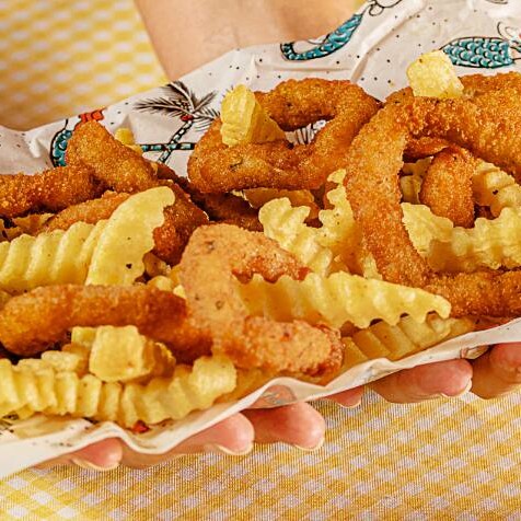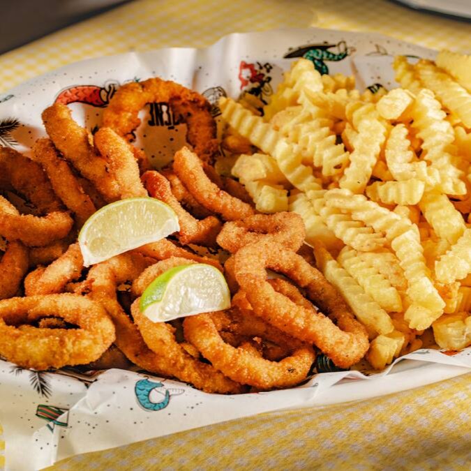 Deliciosos anéis de lula empanados na farinha Panko, acompanhados de batatas crinkle e quatro molhos à sua escolha. (1kg*)