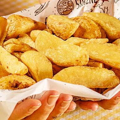 Deliciosas batatas rústicas, quentinhas e crocantes, com o tempero especial Sirène e dois molhos à sua escolha. (500g*)