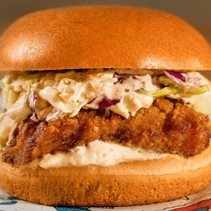Filé de peixe branco empanado na farinha Panko, salada coleslaw (repolho americano) e sour cream, em um macio pão brioche.