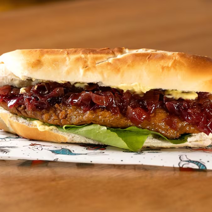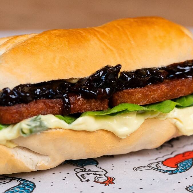 Soja não transgênica, rúcula, cebola roxa caramelizada e molho tártaro vegano. Tudo dentro de um pão saboroso e crocante.