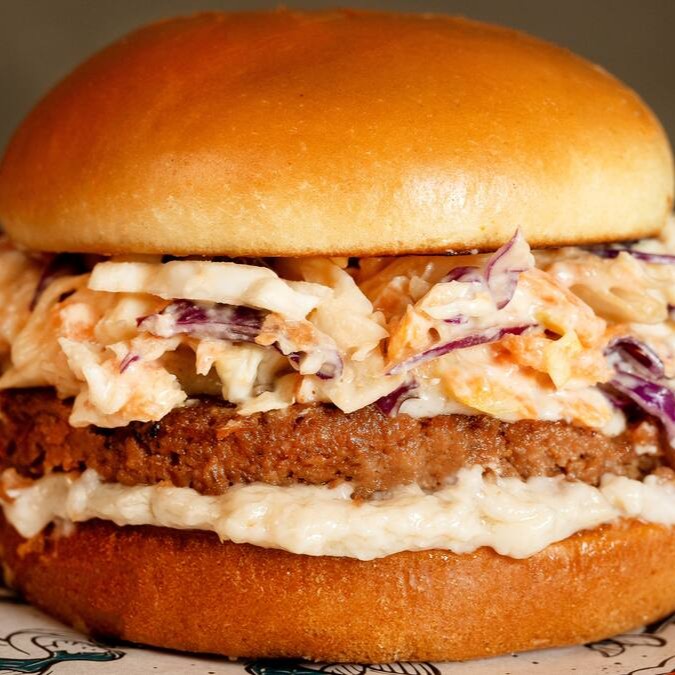 Pão brioche, hambúrguer de ervilha, salada coleslaw e maionese vegana.