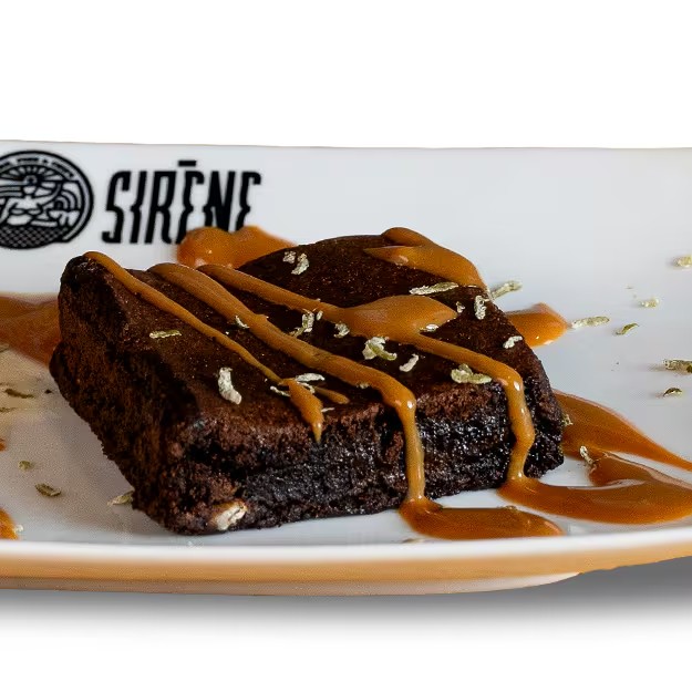 Brownie de chocolate. Acompanha calda de doce de leite da casa.