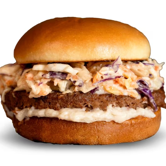 Pão brioche, hambúrguer de ervilha, salada coleslaw e maionese vegana.