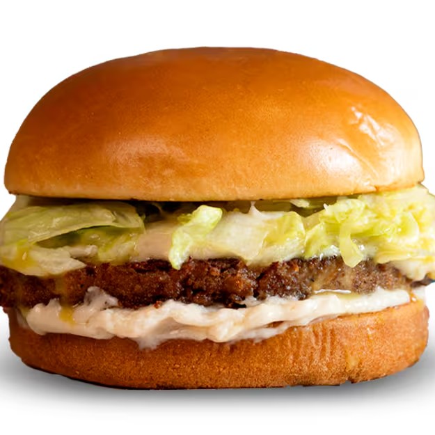 Pão brioche, hambúrguer de ervilha, maionese vegana e alface americana fatiada com mostarda.