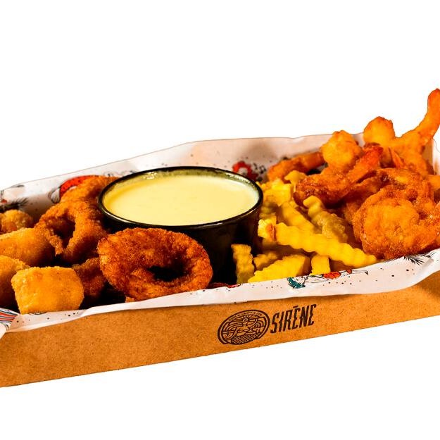 Combinado com tiras de peixe branco empanadas na Panko, camarões, anéis de lula e batatas crinkle, acompanha maionese defumada.