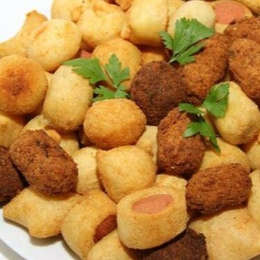 Coxinha de frango,Risoles de Carne,Quibe, Bolinha de Queijo e Enroladinho de Salsicha.