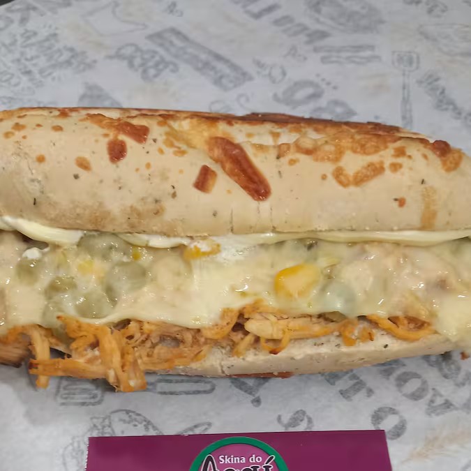 O pão é artesanal com ervas finas e queijo .O recheio é um verdadeiro espetáculo de sabor: frango suculento com o cremoso requeijão, milho, ervilha, bacon, calabresa crocante e queijo derretido, e como cortesia um mini refrigerante