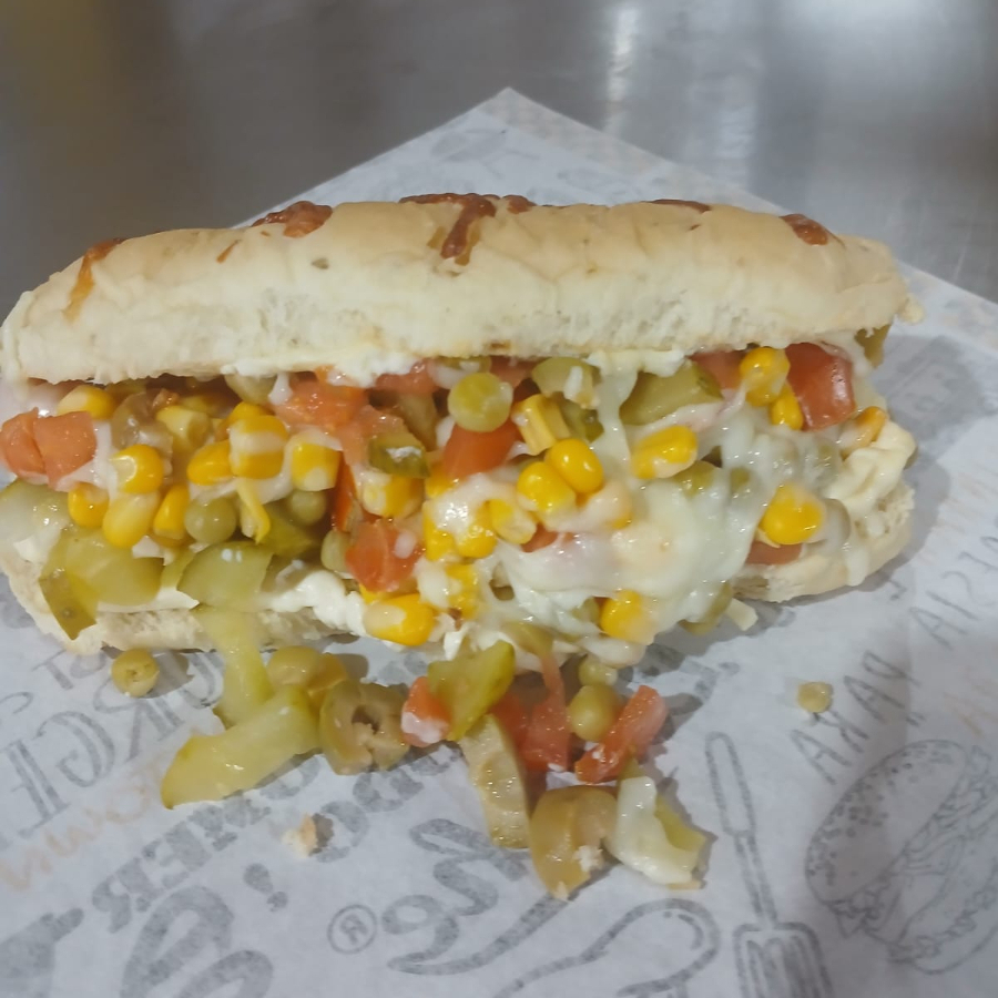Milho,ervilha,azeitona, tomate, pepino agridoce, pão artesanal queijo.