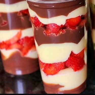 massa de chocolate, recheio de creme de morango, calda na finalização ( FOTO ILUSTRATIVA)