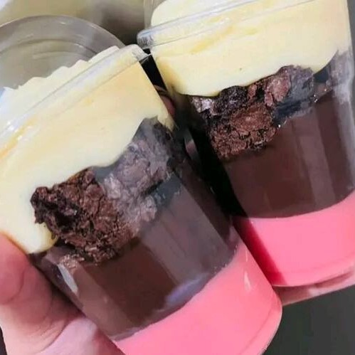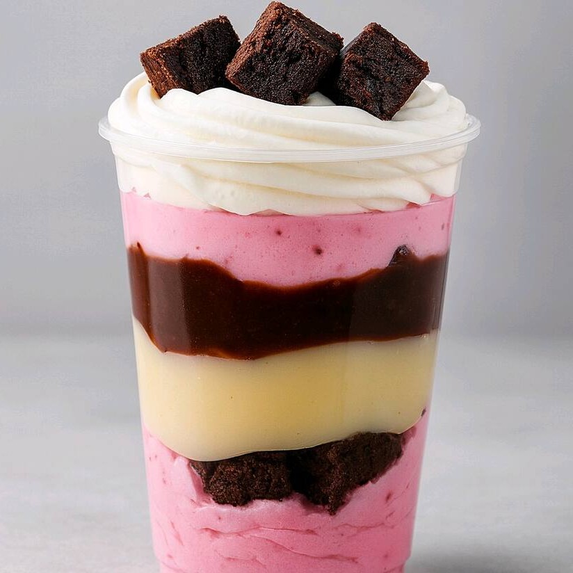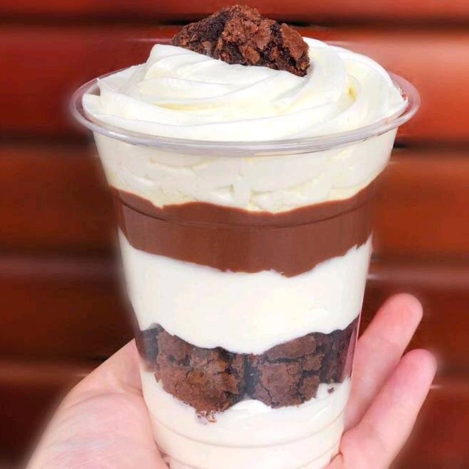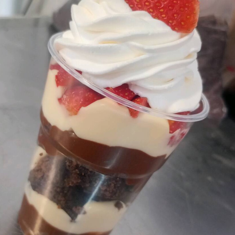 Creme de morango, ganache de chocolate, brownie, creme leite Ninho e chantilly