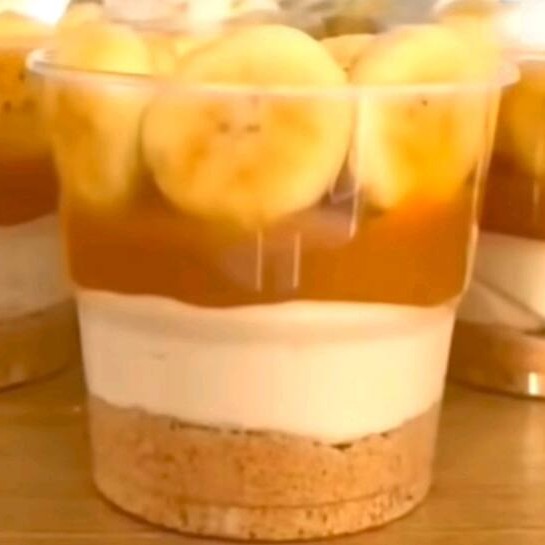 Farofa bolacha, ganache de 4 leites, doce de leite, banana picadas, e chantilly
