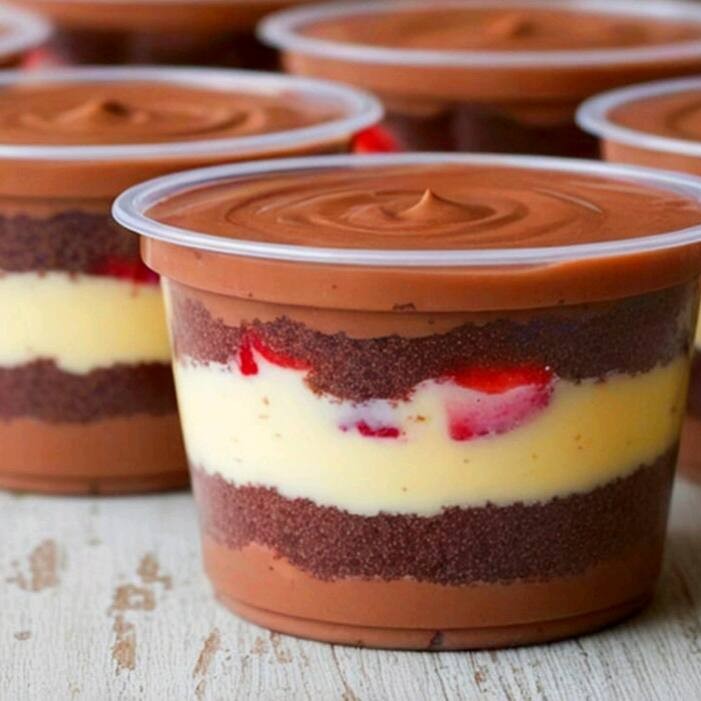 Massa de chocolate, creme de morango recheando
