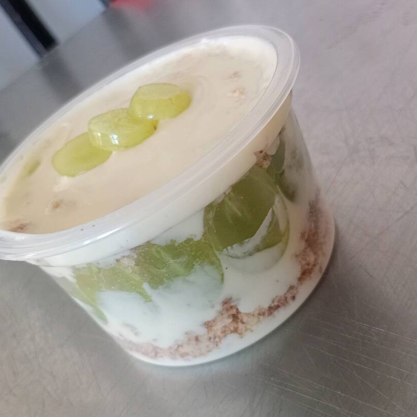 Massa de pão de lo, creme 4 leites, e uvas cortadas