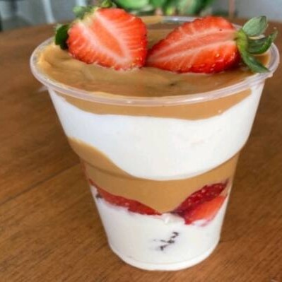 Chantilly, doce de leite, morangos picados e amendoim