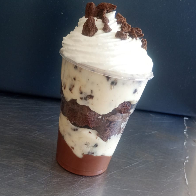 avelã, creme de cookies, brownie e chantilly