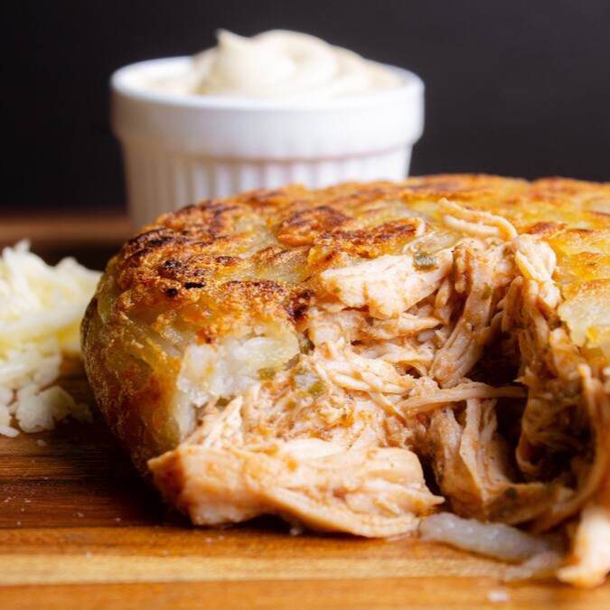 Deliciosa batata recheada com mussarela, carne de panela desfiada, cheddar e orégano.