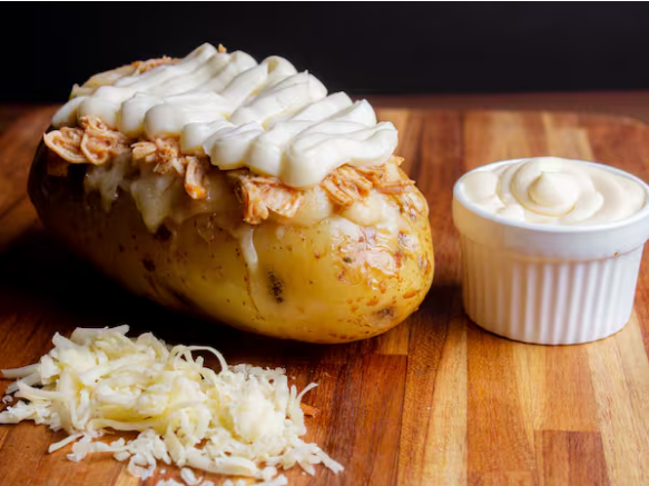 Deliciosa batata suíça recheada com mussarela, frango desfiado temperado, cheddar e uma pitada de orégano.