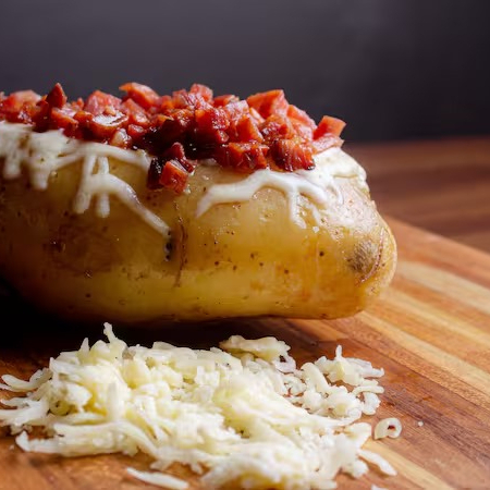 Deliciosa batata recheada com mussarela, bacon, cheddar e orégano.