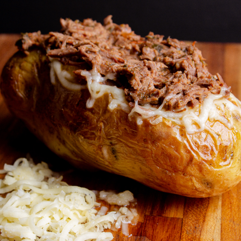 Deliciosa batata suíça recheada com mussarela, carne de panela desfiada e um toque de orégano.
