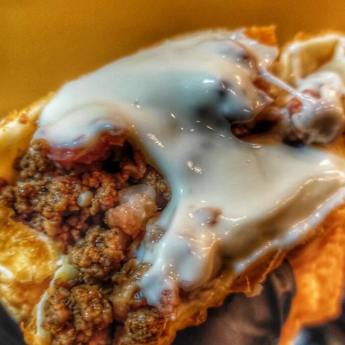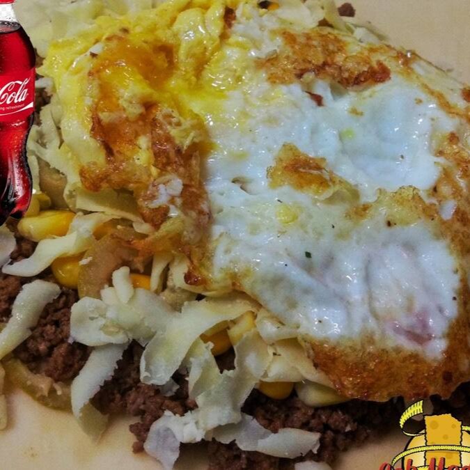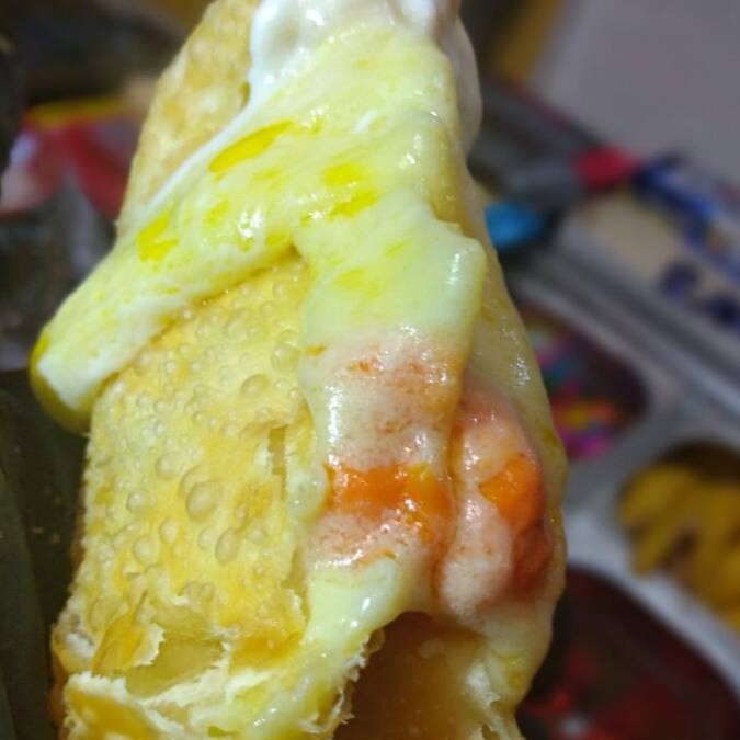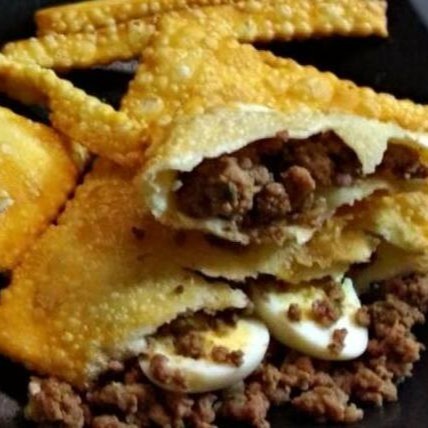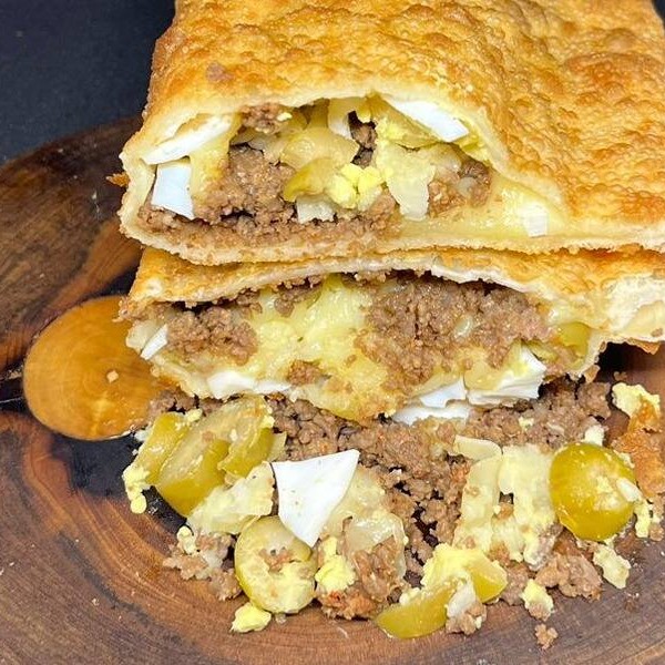 Pastel com carne, queijo, azeitona e ovo frito.