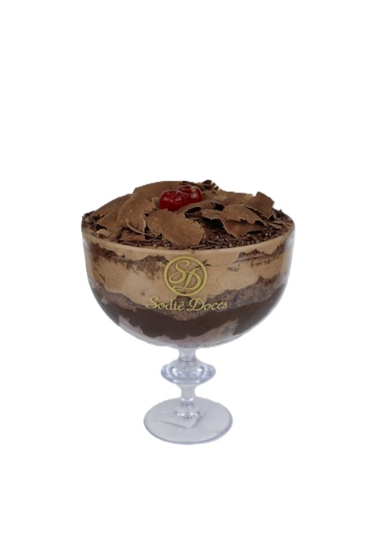Bolo de chocolate, recheio de brigadeiro e cocada, cobertura de mousse de chocolate, raspas de chocolate, calda de chocolate e cerejas.
