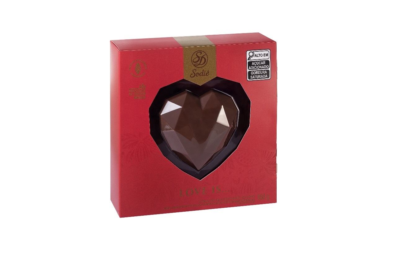 Chocolate ao leite em formato de coração oco com 120g, com 3 bombons incluídos internamento de chocolate ao leite com laranja cristalizada.