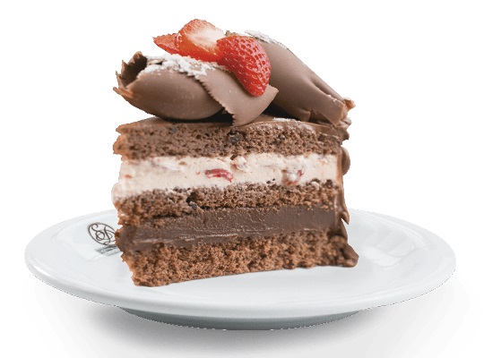 Bolo de chocolate, recheio de brigadeiro, recheio de mousse de leite em pó com morangos, cobertura de mousse de chocolate, raspas de chocolate ao leite, leite em pó e morangos.