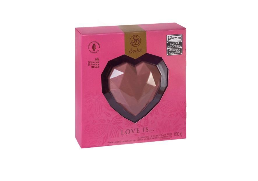 Chocolate ruby em formato de coração oco com 120g, sabor do chocolate frutado, com 3 bombons incluídos internamento de chocolate Ruby com frutas vermelhas.