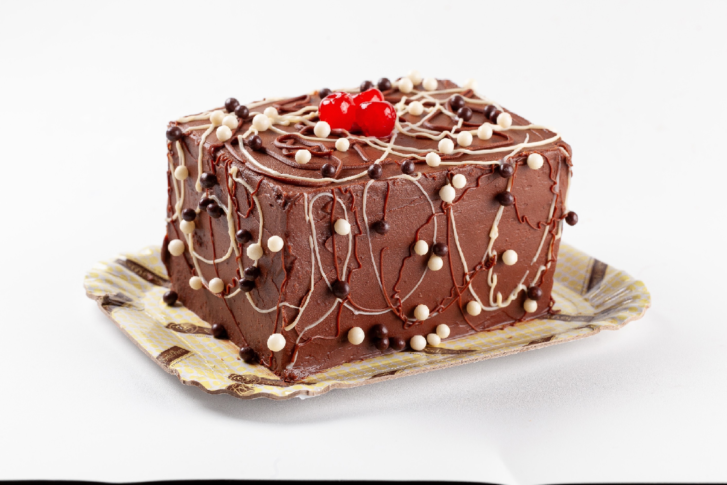 Bolo de massa de chocolate, recheios de trufado de chocolate ao leite e trufas brancas, cobertura de trufado de chocolate ao leite, trufas brancas, bolas de cereais e cerejas decorativas.