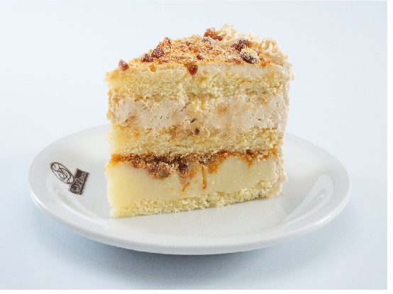 Bolo de massa branca, recheios de leite condensado com crocante de caramelo e mousse branca com crocante de caramelo, cobertura de mousse branca e crocante de caramelo.