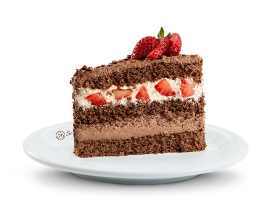 Bolo de massa integral sabor chocolate, recheios de mousse de chocolate e mousse branca zero adição de açúcar com morangos, cobertura de mousse de chocolate, geleia de morango zero adição de açúcar
