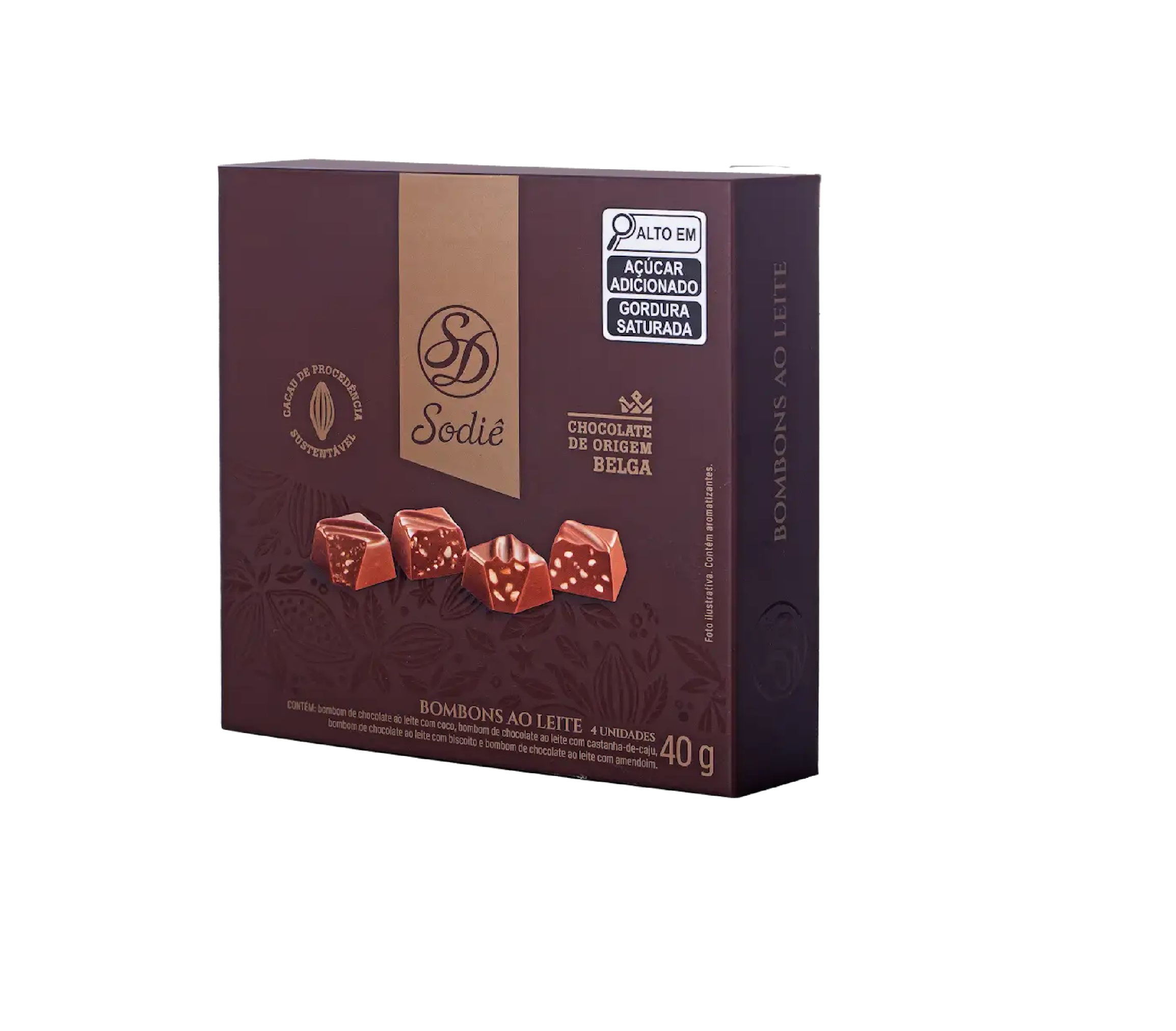 Possui 4 bombons de chocolate ao leite com diferentes inclusões, amendoim, castanha de caju, coco e biscoito, conferindo uma crocância aos produtos.