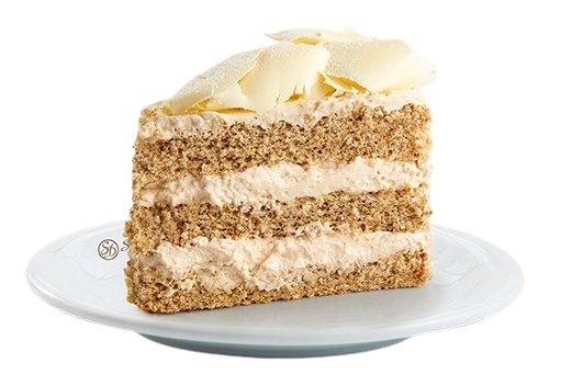 Bolo de massa branca integral, recheio de mousse de leite em pó zero açúcar, cobertura de mousse de leite em pó zero açúcar, decorado com raspas de chocolate branco baixo em açúcares e finalizado com