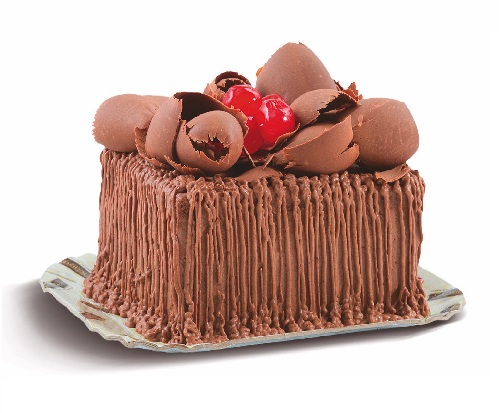 Bolo de chocolate, recheios de mousse de chocolate, cobertura de mousse de chocolate, raspas de chocolate preto e cerejas.