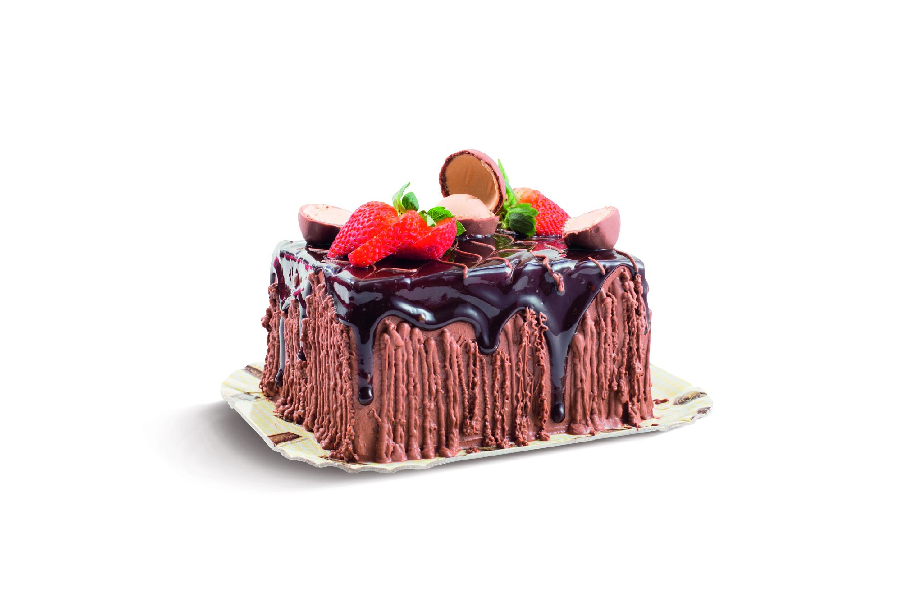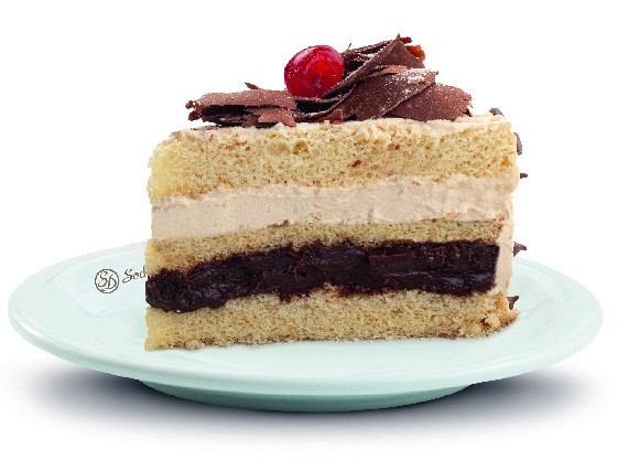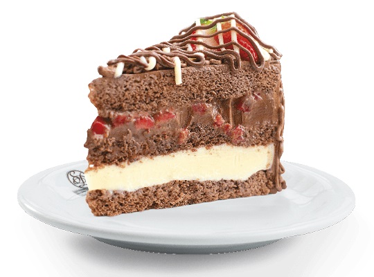 Bolo de massa de chocolate, recheios de mousse de chocolate e trufado de chocolate ao leite, cobertura de mousse de chocolate, raspas de chocolate ao leite, calda de chocolate e cerejas decorativas.