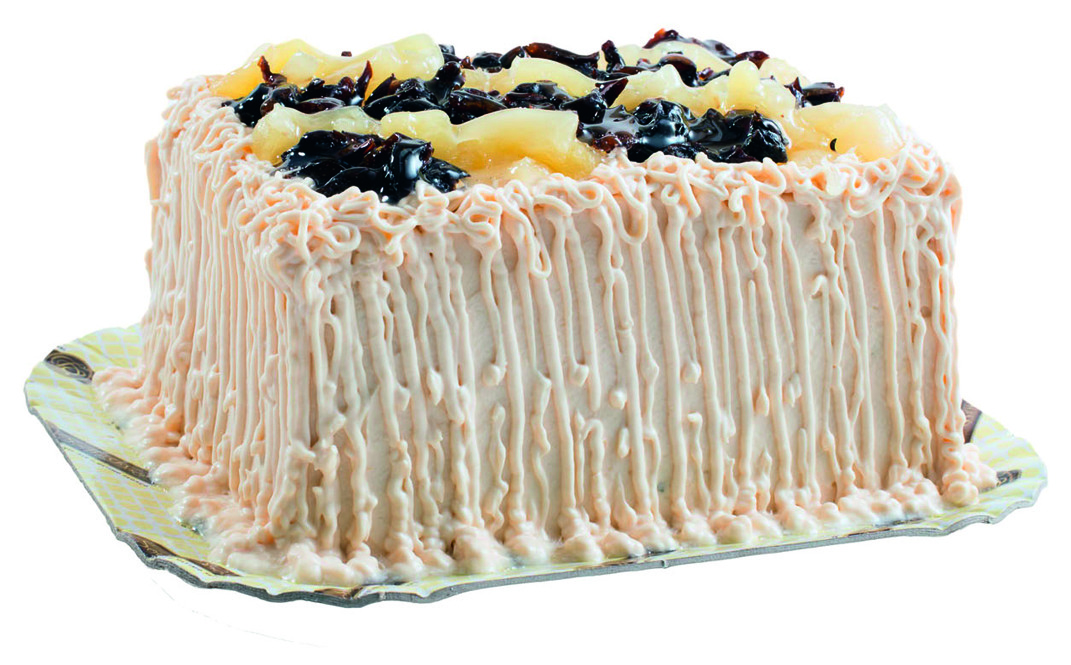 Bolo de massa branca, recheios de creme gelado com abacaxi e doce de leite com ameixas, cobertura de mousse branca, pedaços de abacaxi e ameixas.