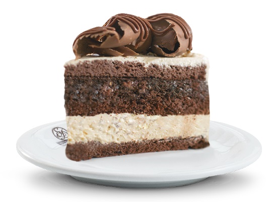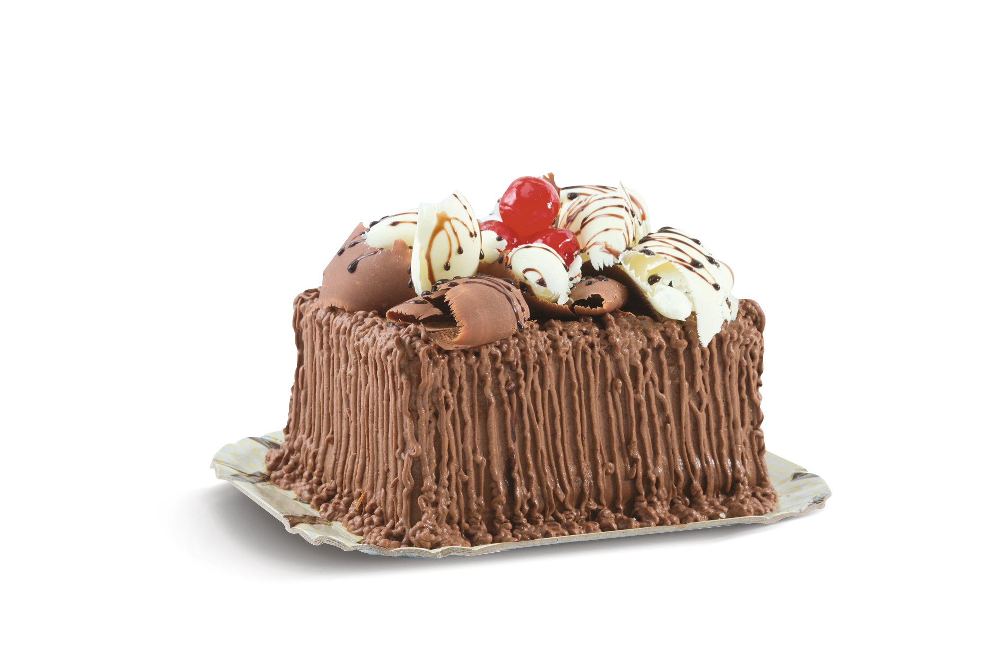 Bolo de massa de chocolate, recheios de mousse de chocolate e creme de chocolate branco aerado, cobertura de mousse de chocolate, raspas de chocolate ao leite e branco e cerejas decorativas.