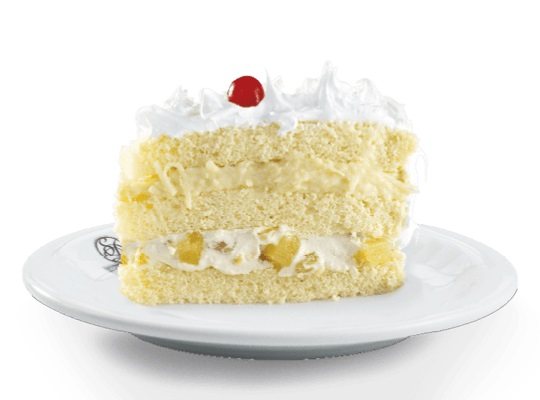 Bolo branco, recheio de mousse branca com abacaxi e cocada, cobertura de marshmallow, coco ralado e cerejas (decorativas).