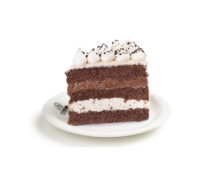 Bolo de chocolate, recheio de mousse branco e trufado de chocolate, cobertura de mousse branco, suspiros e calda de chocolate.