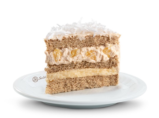 Bolo de massa branca integral, recheios de cocada e mousse branca zero adição de açúcares com pedaços de abacaxi, cobertura de mousse branca zero adição de açúcares com coco ralado.