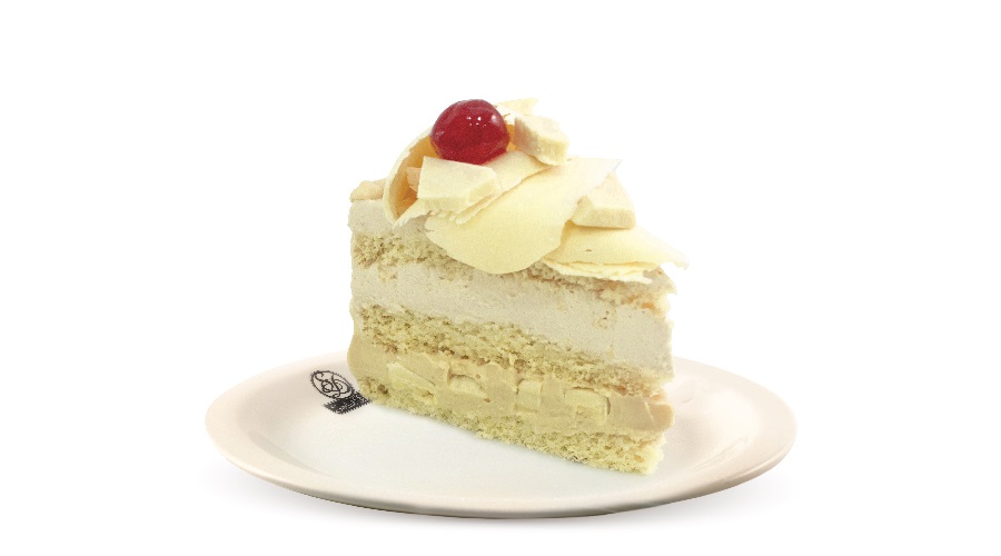 Bolo de massa branca, recheios de trufado branco com pedaços de chocolate branco e mousse branca, cobertura de mousse branca, raspas e pedaços de chocolate branco e cerejas.