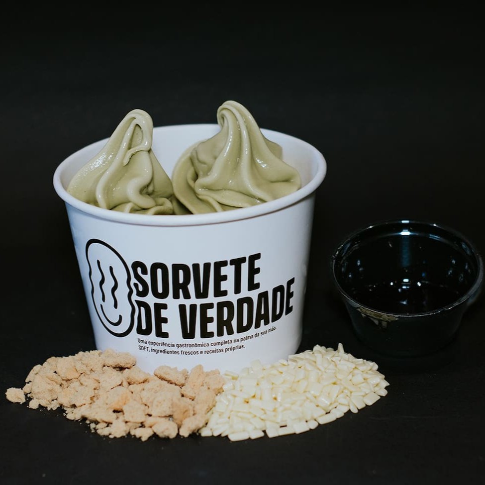 120g de sorvete de Pistache, calda de frutas vermelhas, farofa de bolacha de baunilha e confeitos de chocolate branco. Uma explosão de sabor!