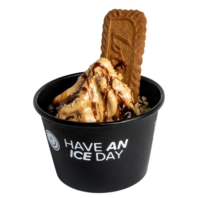 Sorvete de caramelo, calda cookies spicy, farofa de cookies e Biscoff.