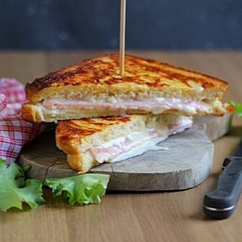 Pão de farinhas funcionais com maionese, queijo mozzarella e presunto, prensado na chapa.