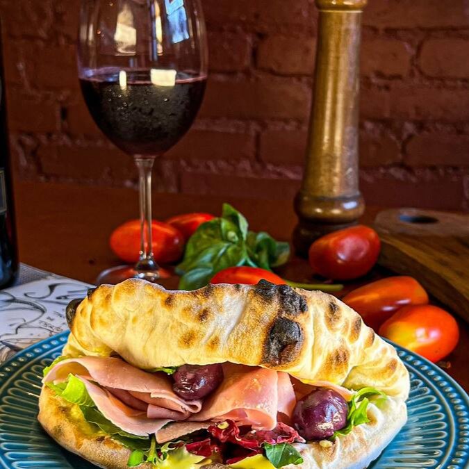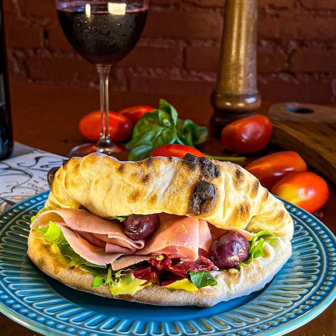 Pão pizza recheado de presunto cru, tomates assados, rúcula e nosso aioli artesanal.