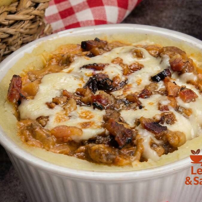 Deliciosa batata recheada no pote com bolonhesa! Uma combinação irresistível de purê de batata cremoso com bolonhesa bem temperada, refogada com cebola, alho e um toque especial de chimichurri, tudo envolto em um saboroso molho de tomate. Perfeita para uma refeição prática e cheia de sabor! Frete Grátis, Promoção, Desconto, Cupom.