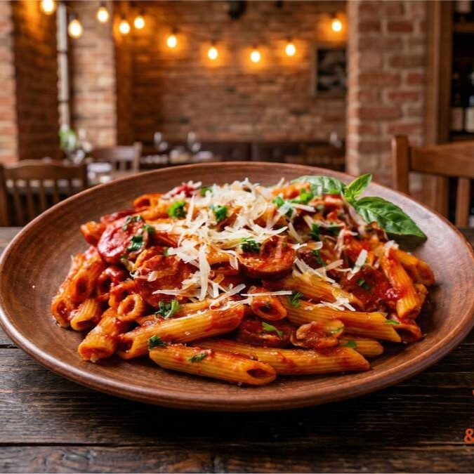 Delicioso macarrão penne cozido al dente, envolvido em um saboroso molho pomodoro artesanal, feito com tomates selecionados. Acompanha generosas fatias de calabresa levemente douradas, que dão um toque defumado irresistível ao prato. Uma combinação perfeita de sabor e conforto, ideal para quem ama uma refeição prática e cheia de personalidade!