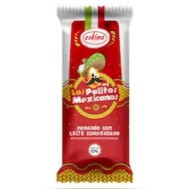 Picolé sabor artificial de doce de leite. Aromatizado artificialmente. Colorido artificialmente.