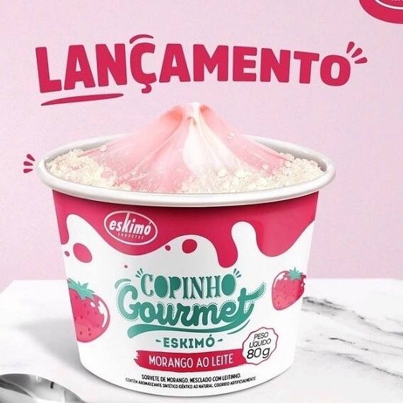 Picolé de morango, recheado com chantilly. Aromatizado artificialmente. Colorido artificialmente.