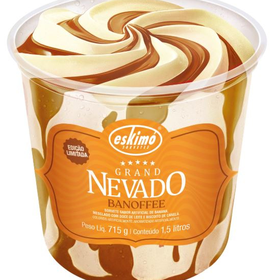 Sorvete sabor artificial de banana, mesclado com doce de leite e biscoito de canela. Colorido artificialmente. Aromatizado artificialmente.